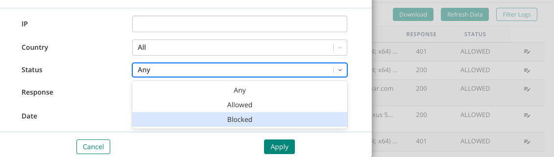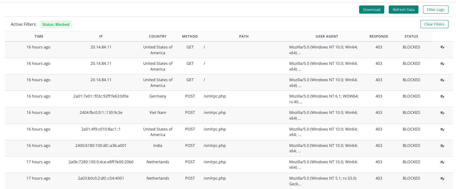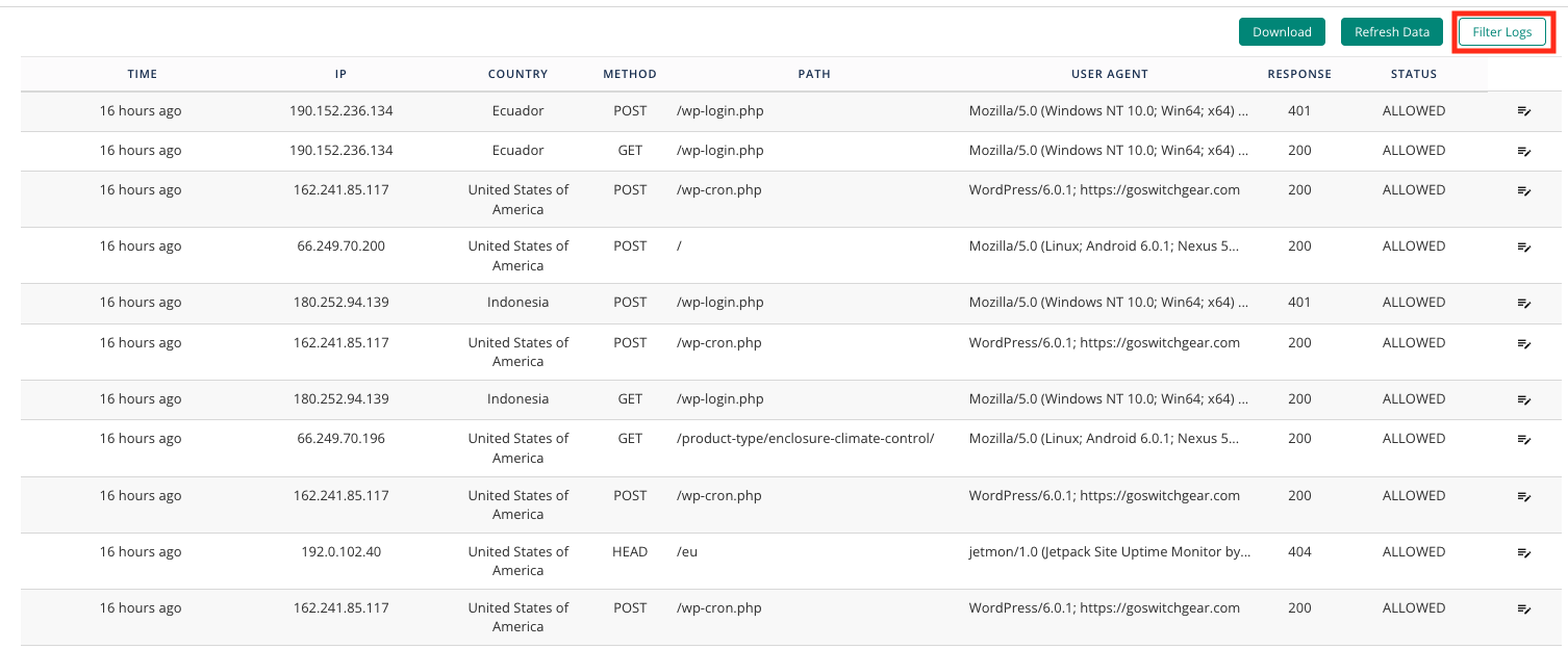 Step 3: The next page will show all traffic logs of your site. Click on the Filter logs option on the top left side of the page.