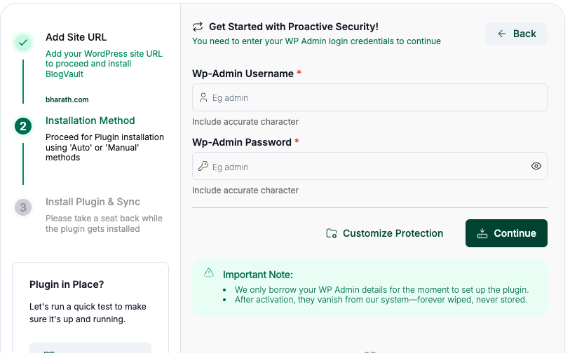 Note: These credentials allow BlogVault to securely install our plugin on the website automatically.