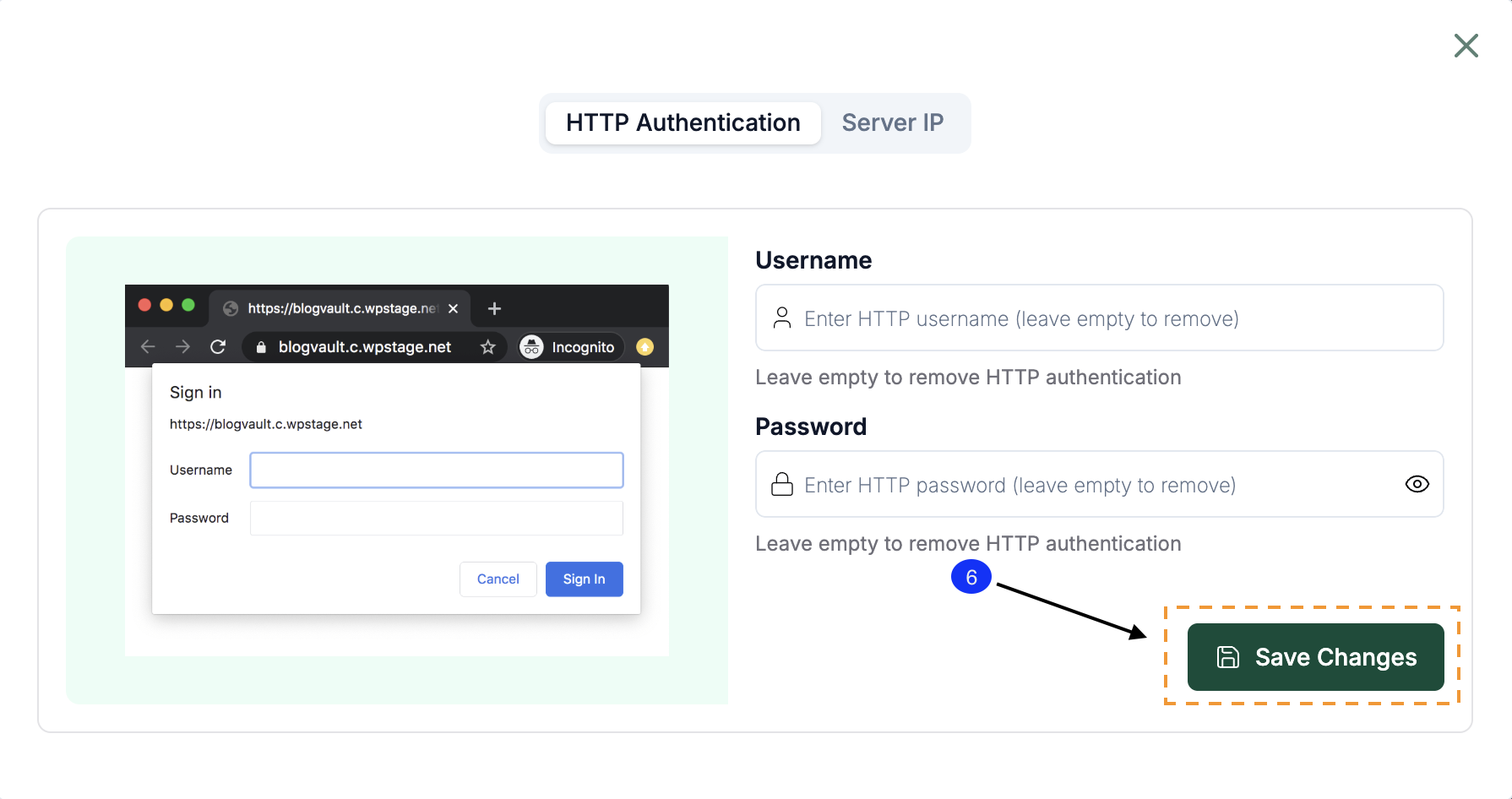 Enter the Username and the password in the HTTP Authentication tab in the center of the page and click on the Save Changes button
