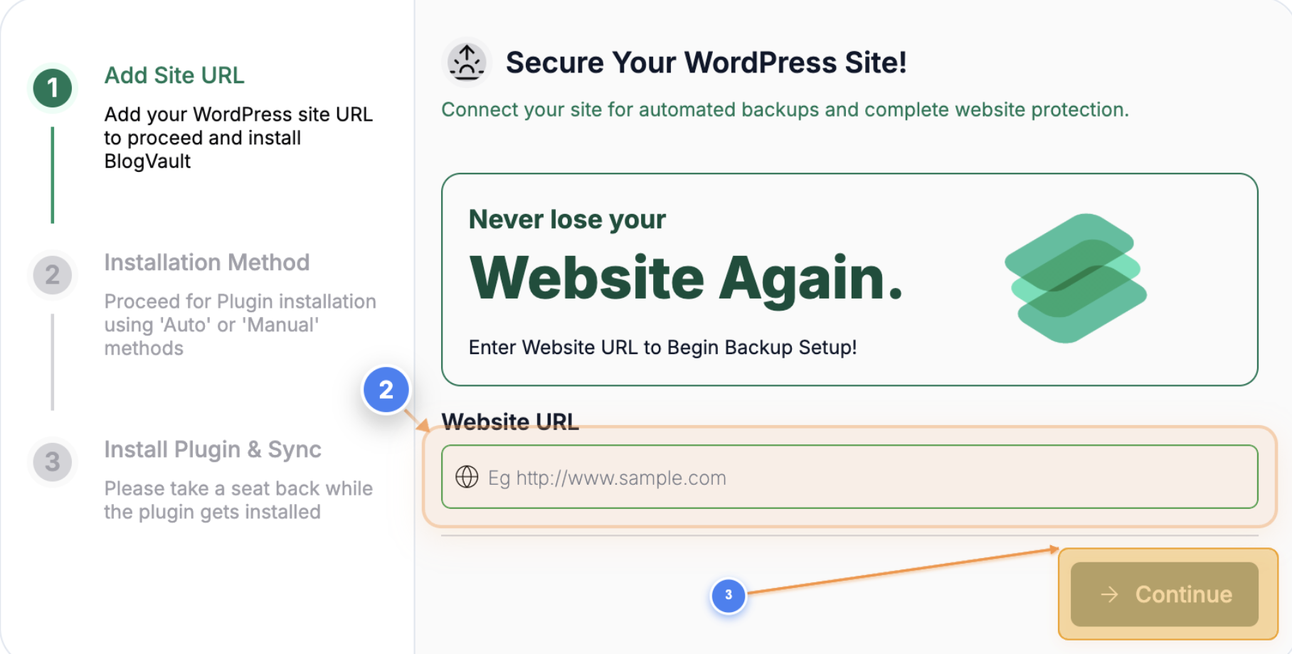 Click in the "Website URL" input field in the center of the page and enter your WordPress website address. Once done, click on the Continue button