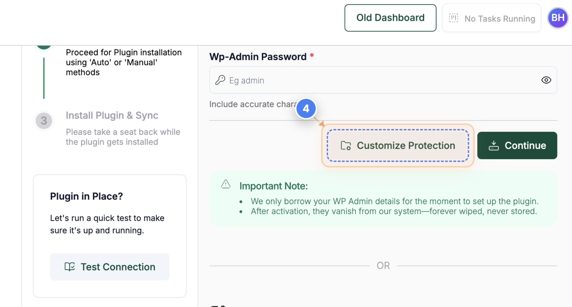 Click the Customize Protection button in the center of the page to set up the HTTP credentials of the website