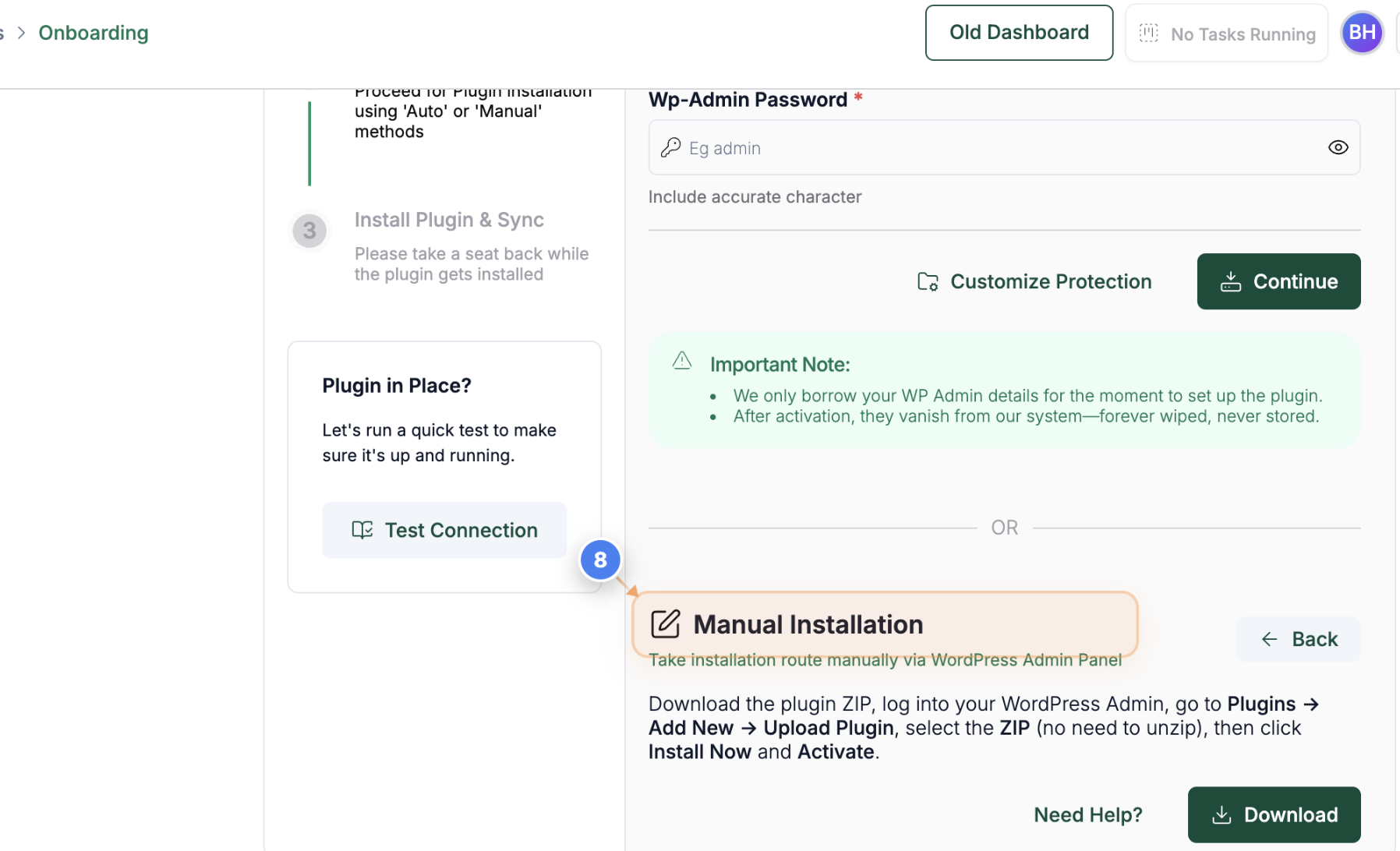 Click the Download button under the Manual Installation option in the center of the page to download the BlogVault plugin and install it manually on your website. Use this option only if you prefer manual installation or if the automatic installation does not complete successfully.