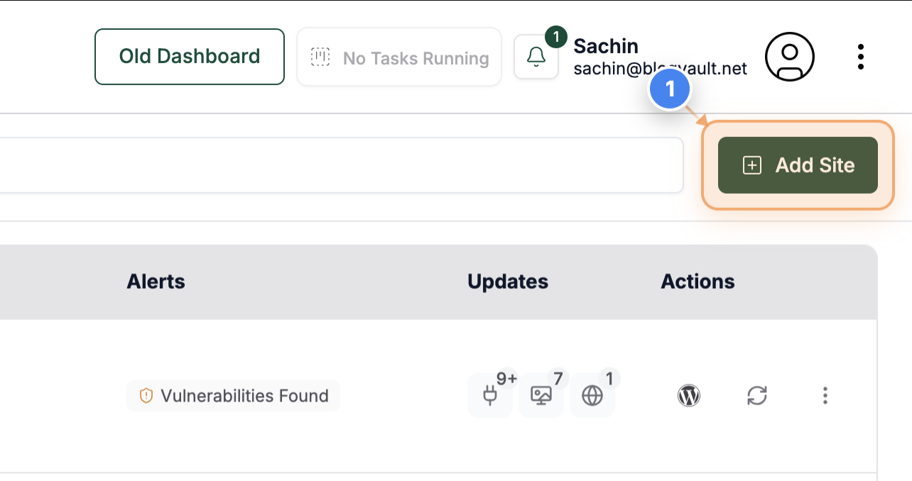 Click on the "Add Site" link in the top-right corner of the Manage Sites page to start adding a new website to your account. You'll be redirected to the site setup process, where you can choose between automatic or manual installation methods.