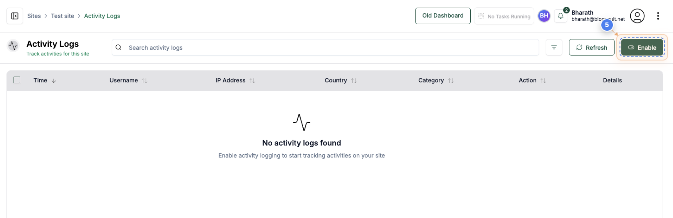Click the enable button in the top-right corner of the Activity Logs page to activate logs for your site.