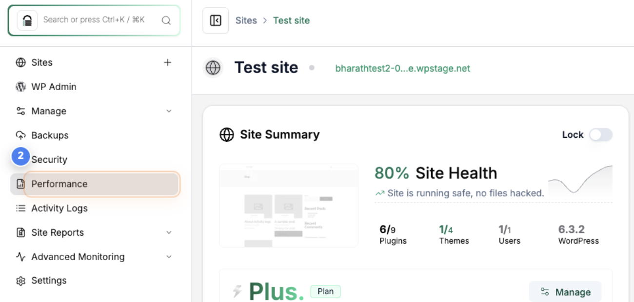 Click the Performance option in the left sidebar to view detailed insights about your site's speed, optimization status, and improvement recommendations.