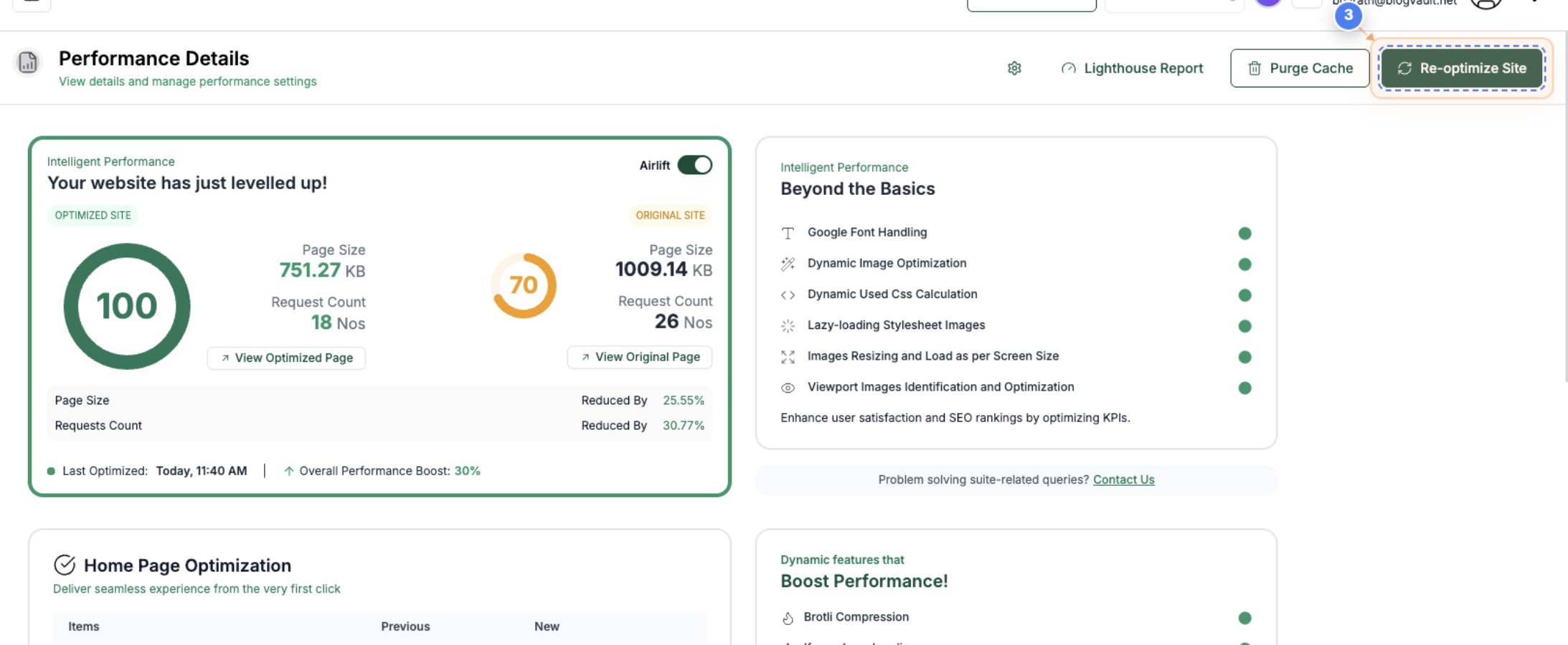 The Performance Optimization page provides real-time progress of the re-optimization process, showing metrics such as page size, load time, and the number of JS and CSS files processed. You can track each step of script minification and image resizing as it happens.