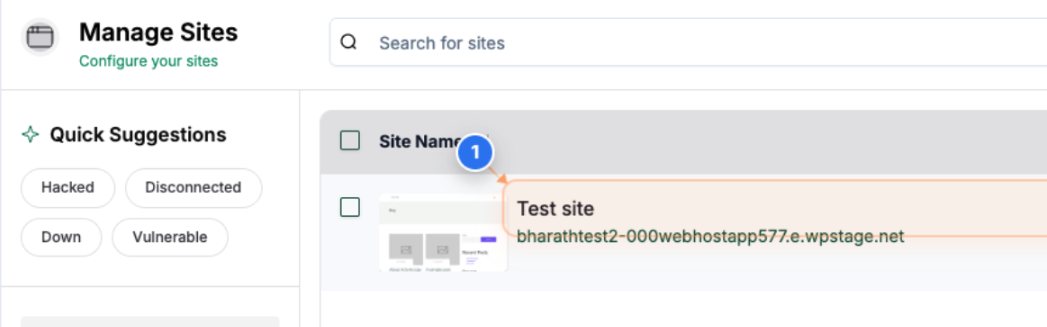 Note: Selecting your site gives access to settings, backups, and other management options.