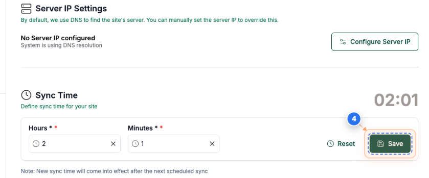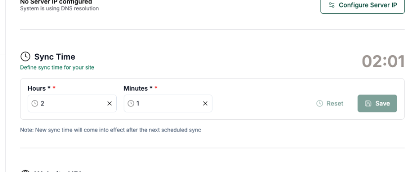 Click inside the Hours and Minutes field in the Sync Time section to enter the desired time for your site's synchronization schedule.