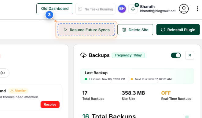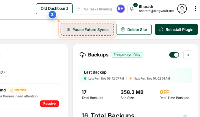 Click the 'Pause Future Syncs' button in the top-right area of the site dashboard to stop automatic synchronization for the site.