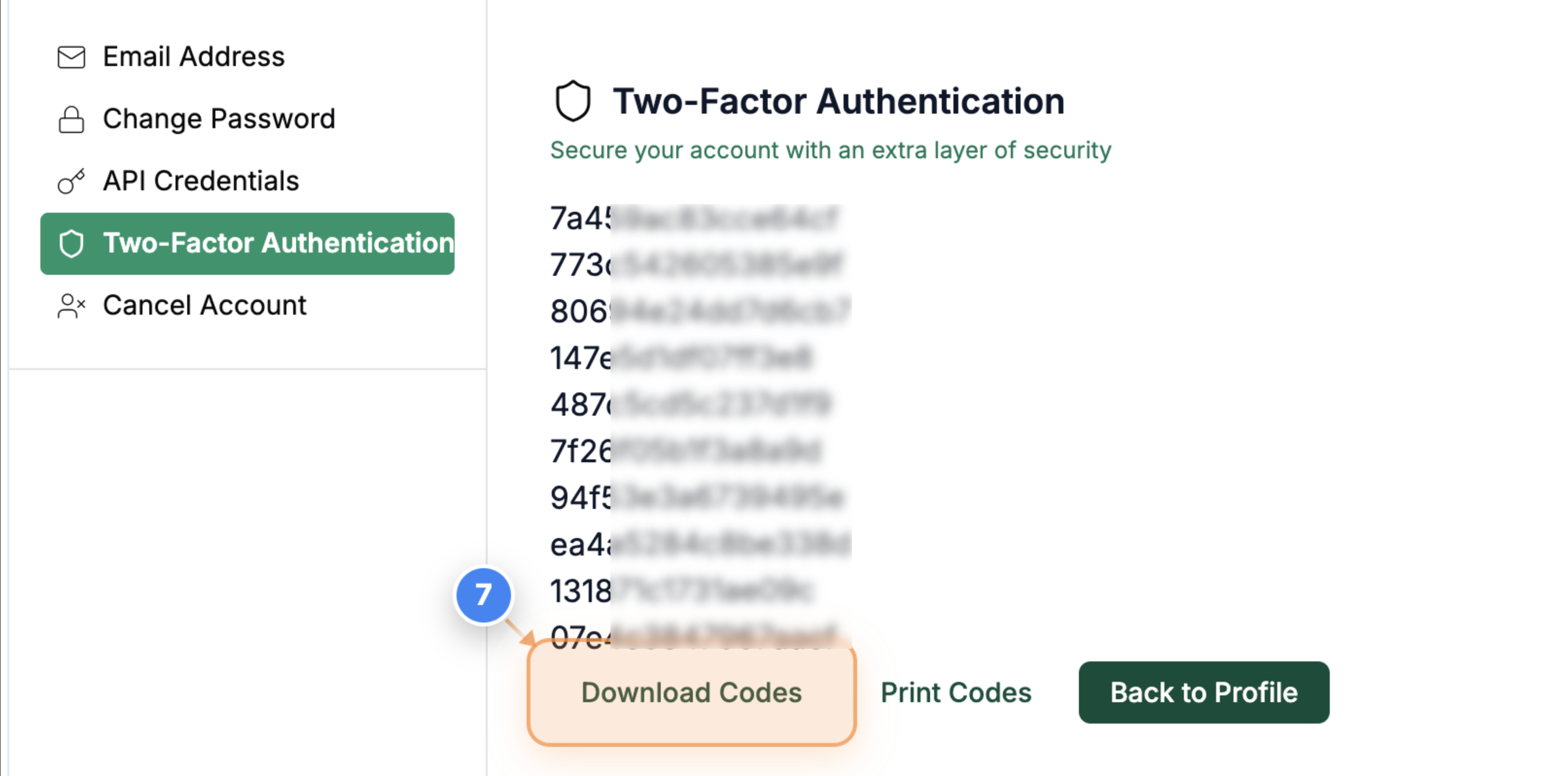 Click the "Download Codes" button in the backup codes section to save your recovery codes for future access.